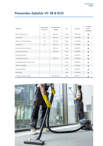 Seite 17TrockensaugerPassendes Zubeh%u00f6r VC 36 B ECOZubeh%u00f6r Nennweite%u00d8 in mmArbeitsbreite/ -l%u00e4ngeVE Art.-Nr.VC 36 BECO2142902Kombi-Bodend%u00fcse 37 280 mm 1 Stk. 2061738Fugend%u00fcse 37 290 mm 1 Stk. 5131985Wand- und Polsterd%u00fcse 37 230 mm 1 Stk. 5131992Saugpinsel 37 150 mm 1 Stk. 5131987B%u00fcrstenstreifen schwarz - 360 mm 1 Stk. 5132007B%u00fcrstenstreifen rot - 360 mm 1 Stk. 2028396Zubeh%u00f6rklammer - - 1 Stk. 5131975Verl%u00e4ngerungsrohr - 560 mm 1 Stk. 5131978Staubfilterbeutel, Papier, 3-lg. - - 1 Stk. 2059164HEPA Abluftfilter - - 1 Stk. 2148637Sicherheitsfilter - - 1 Stk. 5131971Mikrofilter - - 1 Stk. 5131994Verl%u00e4ngerungsschlauch 180-280 mm 1 Stk. 2202227