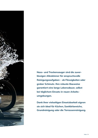 Seite 19Nass- und Trockensauger sind die zuverl%u00e4ssigen Allesk%u00f6nner f%u00fcr anspruchsvolle Reinigungsaufgaben %u2013 ob Fl%u00fcssigkeiten oder grober Schmutz. Ihre robuste Bauweise garantiert eine lange Lebensdauer, selbst bei t%u00e4glichem Einsatz in rauen Arbeitsumgebungen. Dank ihrer vielseitigen Einsetzbarkeit eignen sie sich ideal f%u00fcr K%u00fcchen, Sanit%u00e4rbereiche, Grundreinigung oder die Terrassenreinigung.