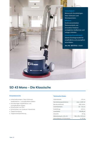 Seite 32EinscheibenmaschinenSD 43 Mono %u2013 Die Klassische Vielseitigkeit: Beherrscht Grundreinigen, Nass-Scheuern und Shampoonieren.Effizienz:Drehmomentstarker Riemenantrieb und innovative Features erm%u00f6glichen kraftarmes und ruhiges Arbeiten.Anwenderfreundlichkeit: Ideales Einstiegsmodell f%u00fcr empfindliche und unempfindliche B%u00f6den.Art.-Nr. 2072713 1 St%u00fcckEinsatzbereiche%u2022 Unterhaltsreinigen / Nass-Scheuern empfindlicher u. unempfindlicher B%u00f6den%u2022 Grundreinigen empfindlicher und unempfindlicher B%u00f6den%u2022 Entschichten von PVC%u2022 Entschichten von Linoleum / Kautschuk%u2022 Teppichreinigung%u2022 TeppichshampoonierungTechnische DatenArbeitsbreite 43 cmNennleistungsaufnahme max. 1.200 WB%u00fcrstendrehzahl 180 U/minUnterfahrh%u00f6he 32 - 34 cmKabell%u00e4nge 12,5 mLautst%u00e4rke 58 dB (A)Gewicht 31 kgAbmessung (L x B x H) 56 x 45 x 122 cmSchutzklasse / IP Schutzart II / IP X4