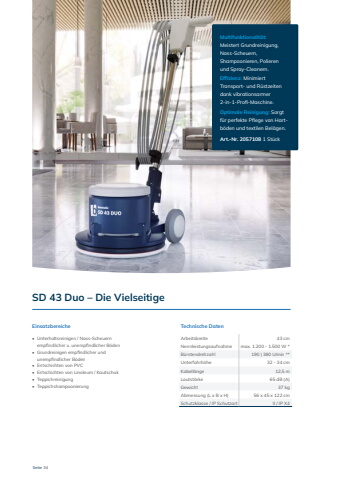 Seite 34EinscheibenmaschinenSD 43 Duo %u2013 Die Vielseitige Multifunktionalit%u00e4t: Meistert Grundreinigung, Nass-Scheuern, Shampoonieren, Polieren und Spray-Cleanern.Effizienz: Minimiert Transport- und R%u00fcstzeiten dank vibrationsarmer 2-in-1-Profi-Maschine.Optimale Reinigung: Sorgt f%u00fcr perfekte Pflege von Hartb%u00f6den und textilen Bel%u00e4gen.Art.-Nr. 2057108 1 St%u00fcckEinsatzbereiche%u2022 Unterhaltsreinigen / Nass-Scheuernempfindlicher u. unempfindlicher B%u00f6den%u2022 Grundreinigen empfindlicher undunempfindlicher B%u00f6den%u2022 Entschichten von PVC%u2022 Entschichten von Linoleum / Kautschuk%u2022 Teppichreinigung%u2022 TeppichshampoonierungTechnische DatenArbeitsbreite 43 cmNennleistungsaufnahme max. 1.200 - 1.500 W *B%u00fcrstendrehzahl 190 | 380 U/min **Unterfahrh%u00f6he 32 - 34 cmKabell%u00e4nge 12,5 mLautst%u00e4rke 65 dB (A)Gewicht 37 kgAbmessung (L x B x H) 56 x 45 x 122 cmSchutzklasse / IP Schutzart II / IP X4