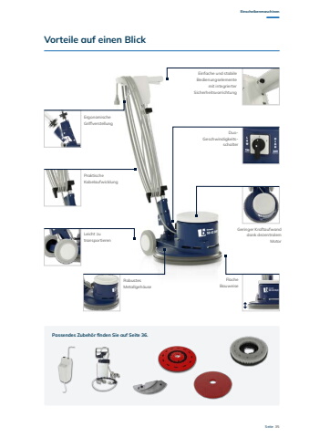 Seite 35EinscheibenmaschinenEinfache und stabile Bedienungselemente mit integrierterSicherheitsvorrichtungDuoGeschwindigkeitsschalterFlache BauweiseRobustes Metallgeh%u00e4usePraktische KabelaufwicklungErgonomische GriffverstellungLeicht zu transportierenGeringer Kraftaufwand dank dezentralem MotorVorteile auf einen BlickPassendes Zubeh%u00f6r finden Sie auf Seite 36.