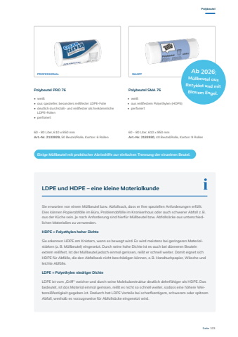 Seite 103PolybeutelPolybeutel SMA 76%u2022 wei%u00df%u2022 aus rei%u00dffestem Polyethylen (HDPE)%u2022 perforiertPolybeutel PRO 7660 - 80 Liter, 610 x 850 mmArt.-Nr. 2133929, 50 Beutel/Rolle, Karton: 6 Rollen60 - 80 Liter, 610 x 850 mmArt.-Nr. 2133930, 40 Beutel/Rolle, Karton: 9 Rollen%u2022 wei%u00df%u2022 aus spezieller, besonders rei%u00dffester LDPE-Folie%u2022 deutlich durchsto%u00df- und rei%u00dffester als herk%u00f6mmliche LDPE-Folien%u2022 perforiertSie erwarten von einem M%u00fcllbeutel bzw. Abfallsack, dass er Ihre speziellen Anforderungen erf%u00fcllt. Dies k%u00f6nnen Papierabf%u00e4lle im B%u00fcro, Problemabf%u00e4lle im Krankenhaus oder auch schwerer Abfall z.%u2009B. aus der K%u00fcche sein. Je nach Anforderung sind hierf%u00fcr M%u00fcllbeutel bzw. Abfalls%u00e4cke aus unterschiedlichen Materialien zu verwenden.HDPE = Polyethylen hoher DichteSie erkennen HDPE am Knistern, wenn es bewegt wird. Es wird meistens bei geringeren Materialst%u00e4rken (z.%u2009B. M%u00fcllbeutel) eingesetzt. Durch seine hohe Dichte ist es auch bei d%u00fcnneren Beuteln extrem rei%u00dffest. Ist der M%u00fcllbeutel jedoch einmal gerissen, rei%u00dft er schnell weiter. Damit eignet sich HDPE f%u00fcr Abf%u00e4lle, die den Abfallsack nicht besch%u00e4digen k%u00f6nnen, z.%u2009B. Handtuchpapier, W%u00e4sche und leichte Abf%u00e4lle.LDPE = Polyethylen niedriger DichteLDPE ist vom %u201eGriff%u201c weicher und durch seine Molekularstruktur deutlich dehnf%u00e4higer als HDPE. Das bedeutet, ist das Material einmal gerissen, rei%u00dft es nicht so schnell weiter, sodass eine h%u00f6here Weiterrei%u00dffestigkeit gegeben ist. Dadurch hat LDPE Vorteile bei scharfkantigem, schwerem oder spitzem Abfall, weshalb es vorzugsweise f%u00fcr Abfalls%u00e4cke eingesetzt wird.LDPE und HDPE %u2013 eine kleine MaterialkundePROFESSIONAL SMART Ab 2026:M%u00fcllbeutel ausRezyklat und mitBlauem Engel.Einige M%u00fcllbeutel mit praktischer Abrisshilfe zur einfachen Trennung der einzelnen Beutel.