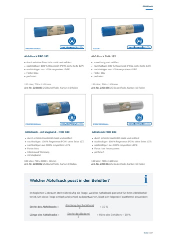 Seite 107AbfallsackAbfallsack PRO 182Abfallsack %u2013 mit Zugband %u2013 PRO 180%u2022 durch erh%u00f6hte Elastizit%u00e4t stabil und rei%u00dffest%u2022 nachhaltiger: 100 % Regenerat (PCW, siehe Seite 127)%u2022 nachhaltiger: aus 100% recyceltem LDPE%u2022 Farbe: blau%u2022 perforiert%u2022 durch erh%u00f6hte Elastizit%u00e4t stabil und rei%u00dffest%u2022 nachhaltiger: 100 % Regenerat (PCW, siehe Seite 127) %u2022 nachhaltiger: aus 100% recyceltem LDPE%u2022 Farbe: blau%u2022 Interleaved Wicklung%u2022 mit ZugbandAbfallsack SMA 182Abfallsack PRO 183120 Liter, 700 x 1100 mmArt.-Nr. 2201086 25 Beutel/Rolle, Karton: 10 Rollen120 Liter, 700 x 1100 mmArt.-Nr. 2201084 25 Beutel/Rolle, Karton: 10 Rollen120 Liter, 700 x 1100 mmArt.-Nr. 2201083 25 Beutel/Rolle, Karton: 10 Rollen120 Liter, 700 x 1000 + 50 mmArt.-Nr. 2201082 25 Beutel/Rolle, Karton: 8 Rollen%u2022 zuverl%u00e4ssig und rei%u00dffest%u2022 nachhaltiger: 100 % Regenerat (PCW, siehe Seite 127)%u2022 nachhaltiger: aus 100% recyceltem LDPE%u2022 Farbe: blau%u2022 perforiert%u2022 durch erh%u00f6hte Elastizit%u00e4t stabil und rei%u00dffest%u2022 nachhaltiger: 100 % Regenerat (PCW, siehe Seite 127) %u2022 nachhaltiger: aus 100% recyceltem LDPE%u2022 Farbe: klar / transparent%u2022 perforiertPROFESSIONALPROFESSIONALSMARTPROFESSIONALIm t%u00e4glichen Gebrauch stellt sich h%u00e4ufig die Frage, welcher Abfallsack passend f%u00fcr Ihren Abfallbeh%u00e4lter ist. Um diese Frage einfach und schnell zu beantworten, l%u00e4sst sich folgende Faustformel anwenden:Breite des Abfallsacks = (Umfang des Beh%u00e4lters)2+ 10 %L%u00e4nge des Abfallsacks = (Breite des Bodens)2+ H%u00f6he des Beh%u00e4lters + 10 %Welcher Abfallsack passt in den Beh%u00e4lter?