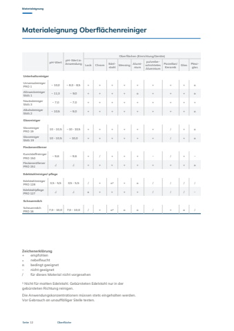 Seite 12MaterialeignungOberfl%u00e4chepH-Wert pH-Wert in AnwendungOberfl%u00e4chen (Einrichtung/Ger%u00e4te)Lack Chrom Edelstahl Messing AluminiumpulverbeschichtetesAluminiumPorzellan/ Keramik Glas PlexiglasUnterhaltsreinigerUniversalreiniger PRO 1 ~ 10,0 ~ 8,0 - 8,5 + + + + + + + + oAllzweckreiniger SMA 1 ~ 11,3 ~ 9,0 + + + + o + + + oNeutralreiniger SMA 3 ~ 7,0 ~ 7,0 + + + + + + + + +Alkoholreiniger SMA 2 ~ 10,5 ~ 9,0 + + + + + + + + oGlasreinigerGlasreiniger PRO 19 10 - 10,5 ~ 10 - 10,5 + + + + + + / + oGlasreiniger SMA 19 10 - 10,5 ~ 10,0 + + + + + + / + oFleckenentferner Kunststoffreiniger PRO 150 ~ 9,6 ~ 9,6 + / + + + %u2013 / + %u2013Fleckenentferner PRO 151 ./. ./. + + + + + + + + oEdelstahlreiniger/-pflegeEdelstahlreiniger PRO 128 3,5 - 5,5 3,5 - 5,5 / + o%u00b9 + o / / / /Edelstahlpflege PRO 127 ./. ./. o + + + + / / / %u2013ScheuermilchScheuermilch PRO 16 7,0 - 10,0 7,0 - 10,0 / + o%u00b9 o o / + o /Zeichenerkl%u00e4rung+ empfohlen* nebelfeuchto bedingt geeignet%u2013 nicht geeignet/ f%u00fcr dieses Material nicht vorgesehen%u00b9 Nicht f%u00fcr matten Edelstahl. Geb%u00fcrsteten Edelstahl nur in der geb%u00fcrsteten Richtung reinigen.Die Anwendungskonzentrationen m%u00fcssen stets eingehalten werden. Vor Gebrauch an unauff%u00e4lliger Stelle testen.Materialeignung Oberfl%u00e4chenreiniger