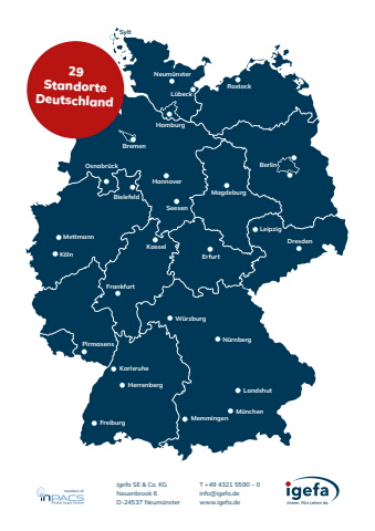 Neum%u00fcnsterRostockSyltL%u00fcbeckHamburgBremenHannoverBielefeldSeesenBerlinLeipzigDresdenErfurtKasselFrankfurtW%u00fcrzburgKarlsruheN%u00fcrnbergLandshutM%u00fcnchenMemmingen FreiburgOsnabr%u00fcckMagdeburgHerrenbergPirmasensMettmannK%u00f6lnmember ofigefa SE & Co. KGNeuenbrook 6D-24537 Neum%u00fcnsterT +49 4321 5590 %u2013 0info@igefa.dewww.igefa.de29Standorte Deutschland
