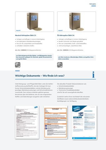 Seite 25Kehrsp%u00e4neNeutral-Kehrsp%u00e4ne SMA 21%u2022 reinigen und pflegen in einem Arbeitsgang%u2022 mit optimalem Staubbindeverm%u00f6gen%u2022 frei von %u00d6l, L%u00f6semitteln und Farbstoffen %u2022 enthalten nat%u00fcrliche Seifen%u00d6l-Kehrsp%u00e4ne SMA 24Art.-Nr. 2289000 25 Kilogramm/Karton Art.-Nr. 2289001 25 Kilogramm/Karton%u2022 reinigen und pflegen in einem Arbeitsgang%u2022 binden Schmutz und Staub gr%u00fcndlich%u2022 frei von L%u00f6semitteln, Duft- und Farbstoffen%u2022 mit hochwertigen, s%u00e4urefreien %u00d6lenzur Kehrreinigung auf allen Boden- und Belagsarten einsetzbar; besonders geeignet f%u00fcr Steinholz, glatte Zementestricheund ge%u00f6lte B%u00f6den auf allen trockenen, %u00f6lbest%u00e4ndigen B%u00f6den und ge%u00f6lten Holzdielen anwendbar Viele Reinigungs- und Pflegemittel fallen unter die Gefahrstoffverordnung (GefStoffV), die das Vorliegen EU-konformer Sicherheitsdatenbl%u00e4tter und die Einhaltung der jeweiligen Betriebsanweisungen und Schutzma%u00dfnahmen vorschreibt. Zum sicheren Arbeiten geh%u00f6ren genaue Kenntnisse %u00fcber die Gefahren, die von den eingesetzten Stoffen und Zubereitungen ausgehen oder entstehen.Die aktuellen Produkt-Dokumentationen wie%u2022 Sicherheitsdatenbl%u00e4tter %u2022 Betriebsanweisungen%u2022 Technische Produktdatenbl%u00e4tter sind f%u00fcr Sie auf www.igefa.de abrufbar.Zus%u00e4tzlich stehen Ihnen bei Bedarf alle relevanten Zertifikate sowie Lebensmittelunbedenklichkeitsbest%u00e4tigungen zur Verf%u00fcgung.Wichtige Dokumente %u2013 Wo finde ich was?SMART SMART
