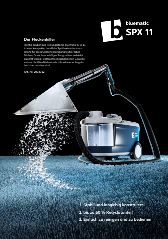 Seite 27BodenDer FleckenkillerRichtig sauber: Die leistungsstarke bluematic SPX 11 ist eine kompakte, handliche Spr%u00fchextraktionsmaschine f%u00fcr die gr%u00fcndliche Reinigung textiler Oberfl%u00e4chen. Dank ihrer kr%u00e4ftigen Saugturbine verbleibt %u00e4u%u00dferst wenig Restfeuchte im behandelten Gewebe, sodass die Oberfl%u00e4chen sehr schnell wieder begehbar bzw. nutzbar sind. Art.-Nr. 20727121. Stabil und langlebig konstruiert 2. bis zu 50 % Recyclatanteil 3. Einfach zu reinigen und zu bedienen