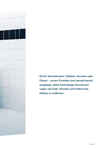 Seite 29Ob f%u00fcr Waschbecken, Toiletten, Duschen oder Fliesen %u2013 unsere Produkte sind speziell darauf ausgelegt, selbst hartn%u00e4ckige Verschmutzungen wie Kalk, Urinstein und Seifenreste effektiv zu entfernen.