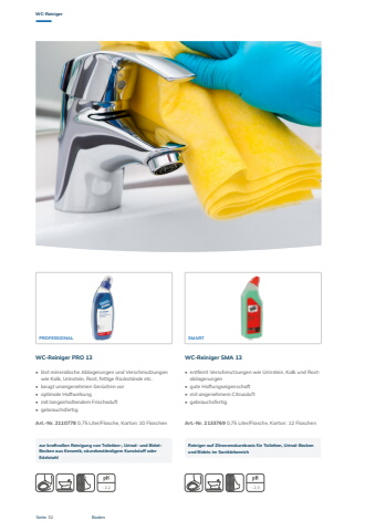 Seite 32WC-ReinigerBodenWC-Reiniger PRO 13%u2022 l%u00f6st mineralische Ablagerungen und Verschmutzungen wie Kalk, Urinstein, Rost, fettige R%u00fcckst%u00e4nde etc.%u2022 beugt unangenehmen Ger%u00fcchen vor%u2022 optimale Haftwirkung%u2022 mit langanhaltendem Frischeduft%u2022 gebrauchsfertigWC-Reiniger SMA 13Art.-Nr. 2110778 0,75 Liter/Flasche, Karton: 10 Flaschen Art.-Nr. 2133769 0,75 Liter/Flasche, Karton: 12 Flaschen%u2022 entfernt Verschmutzungen wie Urinstein, Kalk und Rostablagerungen%u2022 gute Haftungseigenschaft%u2022 mit angenehmem Citrusduft%u2022 gebrauchsfertigzur kraftvollen Reinigung von Toiletten-, Urinal- und BidetBecken aus Keramik, s%u00e4urebest%u00e4ndigem Kunststoff oder Edelstahl Reiniger auf Zitronens%u00e4urebasis f%u00fcr %u00adToiletten, Urinal-Beckenund Bidets im Sanit%u00e4rbereich~ 2,2 ~ 2,3PROFESSIONAL SMART
