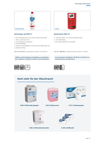 Seite 33Rohrreiniger | BeckensteineRohrreiniger-Gel PRO 77%u2022 l%u00f6st Verstopfungen durch Haare, Seifenr%u00fcckst%u00e4nde, Fette, und Essensreste%u2022 f%u00fcr alle Rohrarten geeignet%u2022 wirkt selbstt%u00e4tig%u2022 beugt bei regelm%u00e4%u00dfiger Anwendung Verstopfungen vor%u2022 gebrauchsfertigBeckensteine SMA 75Art.-Nr. 2173722 1 Liter/Flasche, Karton: 12 Flaschen Art.-Nr. 2165420 1 Kilogramm/Dose, Karton: 12 Dosen%u2022 verhindert Kalk- und Urinsteinablagerungen%u2022 wirkt selbstt%u00e4tig%u2022 f%u00fcr langanhaltenden Frischeduft effektiver, viskoser Reiniger zur Beseitigung von Verstopfungen in Abfl%u00fcssen und Rohren im K%u00fcchen- und Sanit%u00e4rbereichzur Anwendung in Urinalbecken, WC-Rinnen und Pissoirs zur Luftverbesserung in Sanit%u00e4rr%u00e4umen13 - 13,7Noch mehr f%u00fcr den Waschraum!S.68 | Falthandtuchpapier S.63 | Seifencreme S.74 | ToilettenpapierS.65 | Falthandtuchspender S.102 | M%u00fcllbeutelPROFESSIONAL SMART