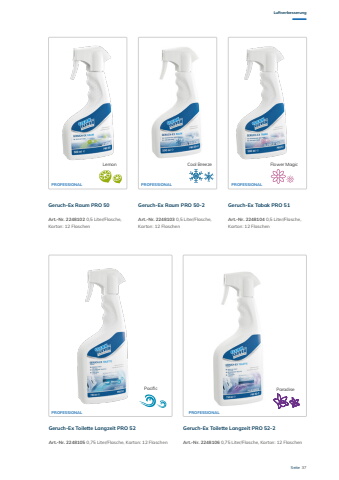 Seite 37LuftverbesserungGeruch-Ex Toilette Langzeit PRO 52Geruch-Ex Raum PRO 50-2Geruch-Ex Toilette Langzeit PRO 52-2Geruch-Ex Raum PRO 50 Geruch-Ex Tabak PRO 51Art.-Nr. 2248106 0,75 Liter/Flasche, Karton: 12 FlaschenArt.-Nr. 2248102 0,5 Liter/Flasche, Karton: 12 FlaschenArt.-Nr. 2248104 0,5 Liter/Flasche, Karton: 12 FlaschenArt.-Nr. 2248105 0,75 Liter/Flasche, Karton: 12 FlaschenArt.-Nr. 2248103 0,5 Liter/Flasche, Karton: 12 FlaschenLemonPacificCool Breeze Flower MagicParadisePROFESSIONALPROFESSIONAL PROFESSIONALPROFESSIONAL PROFESSIONAL