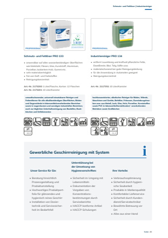 Seite 45Schmutz- und Fettl%u00f6ser | IndustriereinigerSchmutz- und Fettl%u00f6ser PRO 133Art.-Nr. 2173200 1 Liter/Flasche, Karton: 12 FlaschenArt.-Nr. 2173201 10 Liter/Kanister%u2022 anwendbar auf allen wasserbest%u00e4ndigen Oberfl%u00e4chen wie Edelstahl, Fliesen, Glas, Kunststoff, Aluminium, Porzellan, lackiertem Holz, Gummi etc.%u2022 sehr materialvertr%u00e4glich%u2022 frei von Duft- und Farbstoffen%u2022 Reinigungskonzentratumweltschonender, universell einsetzbarer Reiniger und Fettent%u00adferner f%u00fcr alle alkalibest%u00e4ndigen Oberfl%u00e4chen, B%u00f6denund Gegenst%u00e4nde in lebensmittelverarbeitenden Bereichen sowie in Lagerr%u00e4umen und sonstigen industriellen Bereichen;auch zur t%u00e4glichen Unterhaltsreinigung von Back%u00f6fen, Backblechen und GrillelementenEU Ecolabel: DE/020/443~ 10,9Unser Service f%u00fcr Sie:Unterst%u00fctzung bei der Umsetzung von Hygienevorschriften: Ihre Vorteile:%u2022 Beratung hinsichtlich Prozessgestaltung und Produktumstellung%u2022 Hochwertiges Produktportfolio f%u00fcr gl%u00e4nzendes und hygienisch reines Geschirr%u2022 Installation von Dosiertechnik und Servicesicherheit im Bedarfsfall%u2022 Sicherheit im Umgang mit Lebensmitteln %u2022 Dokumentation der Vorgaben von Konzentrationsbestimmungen durch Serviceberichte %u2022 HACCP-konforme Artikel %u2022 HACCP-Schulungen%u2022 Verbrauchsoptimierung %u2022 Sicherheit durch hygienische Sauberkeit%u2022 Produkte in Markenqualit%u00e4t%u2022 Komfortabler Lieferservice%u2022 Sicherheit durch Kundendienst/Servicetechniker%u2022 Bew%u00e4hrte Betreuung vor Ort%u2022 Alles aus einer HandGewerbliche Geschirrreinigung mit SystemIndustriereiniger PRO 134%u2022 entfernt zuverl%u00e4ssig und kraftvoll pflanzliche Fette, Eiwei%u00dfreste, Blut, Talg, S%u00e4fte usw.%u2022 materialschonend bei guter Reinigungsleistung%u2022 f%u00fcr die Anwendung in Automaten geeignet%u2022 ReinigungskonzentratArt.-Nr. 2117351 10 Liter/Kanisterhochkonzentrierter, alkalischer Reiniger f%u00fcr B%u00f6den, W%u00e4nde, Maschinen und Ger%u00e4te, Beh%u00e4lter, Friteusen, Dunstabzugshauben usw. aus Metall, Lack, Glas, Holz, Porzellan, Kunststoffen sowie PVC in lebensmittelherstellenden/- verarbeitenden Betrieben sowie Gro%u00dfk%u00fcchen~ 11,3PROFESSIONAL PROFESSIONAL