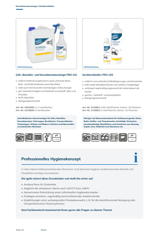 Seite 46Konvektomatenreiniger | Ger%u00e4teentkalkerK%u00fccheGer%u00e4teentkalker PRO 130%u2022 entfernt und verhindert Kalkablagerungen und Kesselstein%u2022 hellt matte Metalloberfl%u00e4chen auf (entfernt Oxidbel%u00e4ge)%u2022 verl%u00e4ngert regelm%u00e4%u00dfig angewandt die Lebensdauer der Ger%u00e4te%u2022 parf%u00fcm-, farbstoff- und phosphatfrei%u2022 Reinigungskonzentrat Art.-Nr. 2110811 0,25 Liter/Flasche, Karton: 20 FlaschenArt.-Nr. 2110812 1 Liter/Flasche, Karton: 12 FlaschenReiniger auf Zitronens%u00e4urebasis f%u00fcr Hei%u00dfwasserger%u00e4te, kleineBoiler, Kaffee- und Teeautomaten, Kocht%u00f6pfe, Eierkocher, s%u00e4urebest%u00e4ndige Oberfl%u00e4chen und Armaturen aus Messing,Kupfer, Zinn, Edelstahl und Aluminium etc.< 2Grill-, Backofen- und Konvektomatenreiniger PRO 132Art.-Nr. 2202350 2 x 1 Liter/KartonArt.-Nr. 2110818 5 Liter/Kanister%u2022 entfernt kraftvoll angebrannte sowie verharzte Back-, Brat- und Grillr%u00fcckst%u00e4nde sowie Rauchteer%u2022 wirkt auch bei besonders hartn%u00e4ckigen Verkrustungen%u2022 gut materialvertr%u00e4glich auf Edelstahl, Kunststoff, Stein und Porzellan%u2022 leicht absp%u00fclbar %u2022 Reinigungskonzentrathochalkalischer Intensivreiniger f%u00fcr Grills, Back%u00f6fen, Konvektomaten, Fahrwagen, Backbleche, Transportb%u00e4nder, Tankanlagen, W%u00e4nde und B%u00f6den in K%u00fcchen und lebensmittelverarbeitenden Betrieben> 13,5In allen lebensmittelverarbeitenden Bereichen sind absolute Hygiene, funktionierende Abl%u00e4ufe und Flexibilit%u00e4t wichtige Grunds%u00e4ulen.Die igefa sichert diese Grunds%u00e4ulen und stellt Sie sicher auf. %u2022 Analyse Ihres Ist-Zustandes%u2022 Abgleich der erhobenen Werte nach HACCP bzw. LMHV%u2022 Gemeinsame Entwicklung eines individuellen Hygienekonzeptes%u2022 Festlegen einzelner, regelm%u00e4%u00dfig durchzuf%u00fchrender Arbeitsschritte%u2022 Empfehlungen einer wirkungsvollen Produktauswahl, z.%u2009B. f%u00fcr die desinfizierende Reinigung oder mit geschlossenen DosiersystemenIhr/e Fachberater/in beantwortet Ihnen gerne alle Fragen zu diesem Thema!Professionelles HygienekonzeptPROFESSIONAL PROFESSIONAL