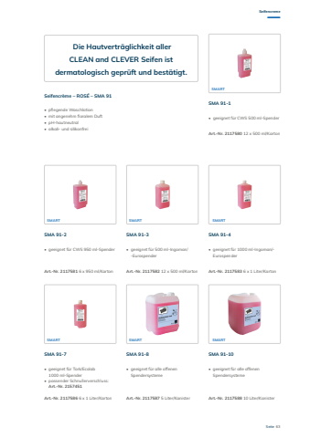 Seite 63SeifencremeSeifencr%u00e8me %u2013 ROS%u00c9 %u2013 SMA 91SMA 91-7SMA 91-2SMA 91-8SMA 91-3SMA 91-10SMA 91-4SMA 91-1%u2022 geeignet f%u00fcr Tork/Ecolab 1000 ml-Spender%u2022 passender Schnullerverschluss: Art.-Nr. 2157451%u2022 geeignet f%u00fcr CWS 950 ml-Spender%u2022 geeignet f%u00fcr alle offenen Spendersysteme%u2022 geeignet f%u00fcr 500 ml-Ingoman/-Eurospender%u2022 geeignet f%u00fcr alle offenen Spendersysteme%u2022 geeignet f%u00fcr 1000 ml-Ingoman/-Eurospender%u2022 geeignet f%u00fcr CWS 500 ml-Spender%u2022 pflegende Waschlotion %u2022 mit angenehm floralem Duft%u2022 pH-hautneutral%u2022 alkali- und silikonfreiArt.-Nr. 2117586 6 x 1 Liter/KartonArt.-Nr. 2117581 6 x 950 ml/KartonArt.-Nr. 2117587 5 Liter/KanisterArt.-Nr. 2117582 12 x 500 ml/KartonArt.-Nr. 2117588 10 Liter/KanisterArt.-Nr. 2117583 6 x 1 Liter/KartonArt.-Nr. 2117580 12 x 500 ml/Karton Die Hautvertr%u00e4glichkeit aller CLEAN and CLEVER Seifen ist dermatologisch gepr%u00fcft und best%u00e4tigt.SMARTSMARTSMARTSMARTSMARTSMARTSMART