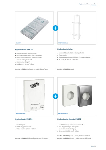 Seite 73Hygienebeutel und -spenderHygienebeutel SMA 70 HygienebeutelhalterHygienebeutel PRO 71 Hygienebeutel Spender PRO 72Art.-Nr. 1670202 (gef%u00e4delt) 10 x 100 St%u00fcck/Paket Art.-Nr. 2076633 1 St%u00fcckArt.-Nr. 2031483 30 St%u00fcck/Box, Karton: 25 BoxenArt.-Nr. 2202000 (wei%u00df) 1 St%u00fcck, Karton: 25 St%u00fcck Art.-Nr. 2202001 (chrom) 1 St%u00fcck, Karton: 25 St%u00fcck%u2022 aus gebleichtem Natronpapier%u2022 mit praktischem Band zum Aufh%u00e4ngen%u2022 Band kann problemlos entfernt werden%u2022 mehrsprachig bedruckt%u2022 Grammatur: 35 g/m%u00b2%u2022 B: 12 cm, H: 29 cm, T: 3 cm%u2022 kunststoffbeschichtetes Drahtgeflecht%u2022 Farbe: wei%u00df%u2022 Fassungsverm%u00f6gen: 100 SMA 70 Hygienebeutel%u2022 B: 13 cm, H: 38 cm, T: 5,5 cm%u2022 Nachf%u00fcllpack %u2022 HDPE-Hygienebeutel%u2022 B: 8,7 cm, H:12,8 cm, T 1,8 cm%u2022 nachf%u00fcllbarer Spender aus Kunststoff%u2022 inkl. doppelseitigen Klebepads sowie Schraubbefestigung%u2022 B: 9,8 cm, H: 13,8 cm, T: 2,6 cmPROFESSIONALPROFESSIONAL PROFESSIONALSMART