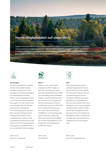 Seite 78WaschraumWaschraumHygiene und Sauberkeit ist unser h%u00f6chster Anspruch. Dabei ist ein bewusster, verantwortungsvollerUmgang mit Reinigungsprodukten und Hygieneartikeln sowie die Auswahl besonders nachhaltigerProdukte und Verfahren entscheidend, um die Belastung f%u00fcr Mensch und Umwelt zu reduzieren.Nachhaltigkeitslabel helfen dem Nutzer bei der Identifizierung gepr%u00fcfter und bewerteter Produkte.Nachhaltigkeitslabel auf einen BlickFSC%u00aeDas G%u00fctesiegel der gemeinn%u00fctzigen Organisation Forest Stewardship Council%u00ae (FSC%u00ae) kennzeichnet Produkte, die aus verantwortungsvoll bewirtschafteten W%u00e4ldern stammen. Zertifiziert sind Waldgebiete, die nach den Kriterien des FSC%u00ae %u00f6kologisch und sozial vertr%u00e4glich bewirtschaftet werden. Zudem sichert die Produktkettenzertifizierung (Chain of Custody) die Identit%u00e4t der FSC%u00ae-zertifizierten Produkte %u00fcber die gesamte Produktkette bis hin zum Endprodukt.Mehr unter: www.fsc-deutschland.dePEFCTMTr%u00e4gt ein Holz- oder Papierprodukt das PEFC-Siegel, so dient dies als Nachweis daf%u00fcr, dass die verarbeiteten Roh-stoffe aus nachhaltig bewirtschafteten W%u00e4ldern und kontrollierten Quellen stammen. Das %u201eProgramme for the Endorsement of Forest Certification Schemes%u201c (PEFCTM) ist ein Waldzertifizierungssystem, nach dessen Standards Waldfl%u00e4chen und Verarbeitungsketten (Dokumen-tation und %u00dcberwachung der Rohstoffquellen und des Materialflusses vom Einkauf bis zum Endprodukt) zertifiziert werden.Mehr unter: www.pefc.deEU EcolabelMit dem Europ%u00e4ischen Umweltzeichen EU Ecolabel werden Produkte ausgezeichnet, die geringere Umweltauswirkungen als vergleichbare Produkte haben. Nach festgelegten Kriterien wird der ge-samte Produktlebenszyklus, von der Gewinnung der Rohstoffe %u00fcber die Herstellung und Verwendung bishin zur Entsorgung f%u00fcr die Zertifizierung der Produkte ber%u00fccksichtigt und beurteilt. Dieses Umweltzeichen wurde von der Europ%u00e4ischen Kommission eingef%u00fchrt und wird in Deutschland im Auftrag des Umweltbundesamtes von der RAL GmbH vergeben.Mehr unter: www.eu-ecolabel.de