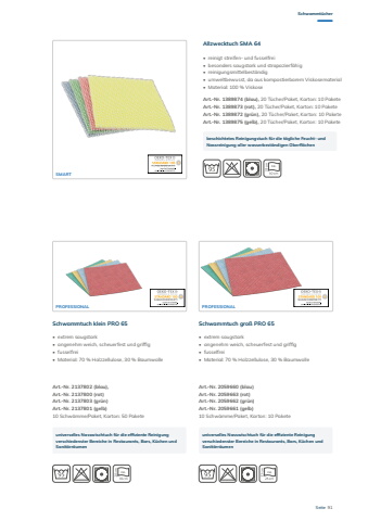Seite 91Schwammt%u00fccherSchwammtuch klein PRO 65%u2022 extrem saugstark%u2022 angenehm weich, scheuerfest und griffig%u2022 fusselfrei%u2022 Material: 70 % Holzzellulose, 30 % BaumwolleSchwammtuch gro%u00df PRO 65%u2022 extrem saugstark%u2022 angenehm weich, scheuerfest und griffig%u2022 fusselfrei%u2022 Material: 70 % Holzzellulose, 30 % Baumwolleuniverselles Nasswischtuch f%u00fcr die effiziente Reinigungverschiedenster Bereiche in Restaurants, Bars, K%u00fcchen und Sanit%u00e4rr%u00e4umenuniverselles Nasswischtuch f%u00fcr die effiziente Reinigungverschiedenster Bereiche in Restaurants, Bars, K%u00fcchen und Sanit%u00e4rr%u00e4umenca. ca.Art.-Nr. 2137802 (blau), Art.-Nr. 2137800 (rot) Art.-Nr. 2137803 (gr%u00fcn)Art.-Nr. 2137801 (gelb)10 Schw%u00e4mme/Paket, Karton: 50 PaketeArt.-Nr. 2059660 (blau)Art.-Nr. 2059663 (rot)Art.-Nr. 2059662 (gr%u00fcn)Art.-Nr. 2059661 (gelb)10 Schw%u00e4mme/Paket, Karton: 10 PaketeAllzwecktuch SMA 64%u2022 reinigt streifen- und fusselfrei%u2022 besonders saugstark und strapazierf%u00e4hig%u2022 reinigungsmittelbest%u00e4ndig%u2022 umweltbewusst, da aus kompostierbarem Viskosematerial%u2022 Material: 100 % Viskosebeschichtetes Reinigungstuch f%u00fcr die t%u00e4gliche Feucht- und Nassreinigung aller wasserbest%u00e4ndigen Oberfl%u00e4chenca.Art.-Nr. 1389874 (blau), 20 T%u00fccher/Paket, Karton: 10 PaketeArt.-Nr. 1389873 (rot), 20 T%u00fccher/Paket, Karton: 10 PaketeArt.-Nr. 1389872 (gr%u00fcn), 20 T%u00fccher/Paket, Karton: 10 PaketeArt.-Nr. 1389875 (gelb), 20 T%u00fccher/Paket, Karton: 10 PaketeSMARTPROFESSIONAL PROFESSIONAL