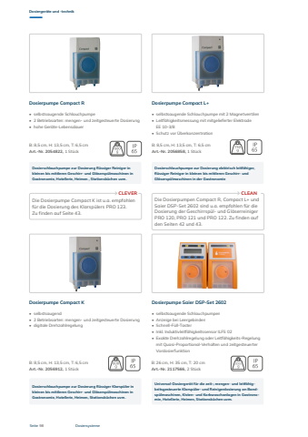 Seite 98Dosierger%u00e4te und -technikDosiersystemeDosierpumpe Compact RDosierpumpe Compact K%u2022 selbstsaugende Schlauchpumpe%u2022 2 Betriebsarten: mengen- und zeitgesteuerte Dosierung%u2022 hohe Ger%u00e4te-Lebensdauer%u2022 selbstsaugend%u2022 2 Betriebsarten: mengen- und zeitgesteuerte Dosierung%u2022 digitale DrehzahlregelungDosierpumpe Compact L+Dosierpumpe Saier DSP-Set 2602B: 8,5 cm, H: 13,5 cm, T: 6,5 cmArt.-Nr. 2056858, 1 St%u00fcckB: 26 cm, H: 35 cm, T: 20 cmArt.-Nr. 2117566, 2 St%u00fcckB: 8,5 cm, H: 13,5 cm, T: 6,5 cmArt.-Nr. 2054822, 1 St%u00fcckB: 8,5 cm, H: 13,5 cm, T: 6,5 cm Art.-Nr. 2056912, 1 St%u00fcck%u2022 selbstsaugende Schlauchpumpe mit 2 Magnetventilen%u2022 Leitf%u00e4higkeitsmessung mit mitgelieferter Elektrode EE 10-3/8%u2022 Schutz vor %u00dcberkonzentration%u2022 selbstsaugende Schlauchpumpen%u2022 Anzeige bei Leergebinden%u2022 Schnell-F%u00fcll-Taster%u2022 Inkl. Induktivleitf%u00e4higkeitssensor ILFS 02%u2022 Exakte Drehzahlregelung oder Leitf%u00e4higkeits-Regelung mit Quasi-Proportional-Verhalten und zeitgesteuerter VordosierfunktionDosierschlauchpumpe zur Dosierung fl%u00fcssiger Reiniger inkleinen bis mittleren Geschirr- und Gl%u00e4sersp%u00fclmaschinen in Gastronomie, Hotellerie, Heimen , Stationsk%u00fcchen uvm.Dosierschlauchpumpe zur Dosierung fl%u00fcssiger Klarsp%u00fcler inkleinen bis mittleren Geschirr- und Gl%u00e4sersp%u00fclmaschinen in Gastronomie, Hotellerie, Heimen, Stationsk%u00fcchen uvm.Dosierschlauchpumpe zur Dosierung elektrisch leitf%u00e4higer, fl%u00fcssiger Reiniger in kleinen bis mittleren Geschirr- undGl%u00e4sersp%u00fclmaschinen in der GastronomieUniversal-Dosierger%u00e4t f%u00fcr die zeit-, mengen- und leitf%u00e4higkeitsgesteuerte Klarsp%u00fcler- und Reinigerdosierung an Bandsp%u00fclmaschinen, Kisten- und Korbwaschanlagen in Gastronomie, Hotellerie, Heimen, Stationsk%u00fcchen uvm.Die Dosierpumpe Compact K ist u.a. empfohlen f%u00fcr die Dosierung des Klarsp%u00fclers PRO 123. Zu finden auf Seite 43.Die Dosierpumpen Compact R, Compact L+ und Saier DSP-Set 2602 sind u.a. empfohlen f%u00fcr die Dosierung der Geschirrsp%u00fcl- und Gl%u00e4serreiniger PRO 120, PRO 121 und PRO 122. Zu finden auf den Seiten 42 und 43.CLEVER CLEAN