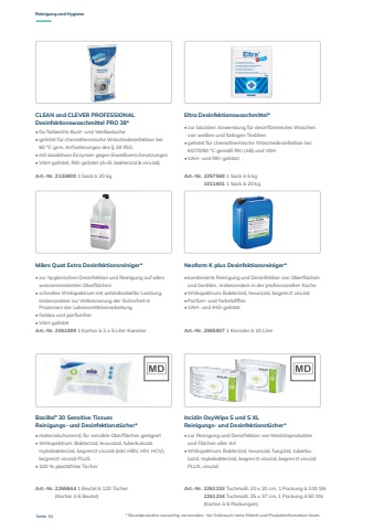 Seite 34Bacillol%u00ae 30 Sensitive Tissues Reinigungs- und Desinfektionst%u00fccher*Incidin OxyWipe S und S XL Reinigungs- und Desinfektionst%u00fccher*Art.-Nr. 2265844 1 Beutel %u00e0 120 T%u00fccher (Karton %u00e0 6 Beutel)Art.-Nr. 2261233 Tuchma%u00df: 20 x 20 cm, 1 Packung %u00e0 100 Stk 2261234 Tuchma%u00df: 25 x 37 cm, 1 Packung %u00e0 50 Stk (Karton %u00e0 6 Packungen)%u2022 materialschonend, f%u00fcr sensible Oberfl%u00e4chen geeignet%u2022Wirkspektrum: Bakterizid, levurozid, tuberkulozid, mykobakterizid, begrenzt viruzid (inkl. HBV, HIV, HCV), begrenzt viruzid PLUS%u2022 100 % plastikfreie T%u00fccher%u2022 zur Reinigung und Desinfektion von Medizinprodukten und Fl%u00e4chen aller Art%u2022Wirkspektrum: Bakterizid, levurozid, fungizid, tuberkulozid, mykobakterizid, begrenzt viruzid, begrenzt viruzid PLUS, viruzid* Biozidprodukte vorsichtig verwenden. Vor Gebrauch stets Etikett und Produktinformation lesen.Mikro Quat Extra Desinfektionsreiniger* Neoform K plus Desinfektionsreiniger*Art.-Nr. 2061399 1 Karton %u00e0 2 x 5 Liter Kanister Art.-Nr. 2065907 1 Kanister %u00e0 10 Liter%u2022 zur hygienischen Desinfektion und Reinigung auf allen wasserresistenten Oberfl%u00e4chen%u2022 schnelles Wirkspektrum mit antimikrobieller Leistung, insbesondere zur Verbesserung der Sicherheit in Prozessen der Lebensmittelverarbeitung%u2022 farblos und parf%u00fcmfrei%u2022 VAH-gelistet%u2022 kombinierte Reinigung und Desinfektion von Oberfl%u00e4chen und Ger%u00e4ten, insbesondere in der professionellen K%u00fcche%u2022Wirkspektrum: Bakterizid, levurozid, begrenzt viruzid%u2022 Parf%u00fcm- und farbstofffrei%u2022 VAH- und IHO-gelistetCLEAN and CLEVER PROFESSIONAL Desinfektionswaschmittel PRO 38*Eltra Desinfektionswaschmittel*Art.-Nr. 2133800 1 Sack %u00e0 20 kg Art.-Nr. 2257569 1 Sack %u00e0 6 kg1011601 1 Sack %u00e0 20 kg%u2022 f%u00fcr farbechte Bunt- und Wei%u00dfw%u00e4sche%u2022 gelistet f%u00fcr chemothermische W%u00e4schedesinfektion bei 60 %u00b0C gem. Anforderungen des %u00a7 18 IfSG%u2022 mit bioaktiven Enzymen gegen Eiwei%u00dfverschmutzungen%u2022 VAH-gelistet, RKI-gelistet (A+B, bakterizid & viruzid)%u2022 zur bioziden Anwendung f%u00fcr desinfizierendes Waschen von wei%u00dfen und farbigen Textilien%u2022 gelistet f%u00fcr chemothermische W%u00e4schedesinfektion bei 60/70/80 %u00b0C gem%u00e4%u00df RKI (AB) und VAH%u2022 VAH- und RKI-gelistetReinigung und Hygiene