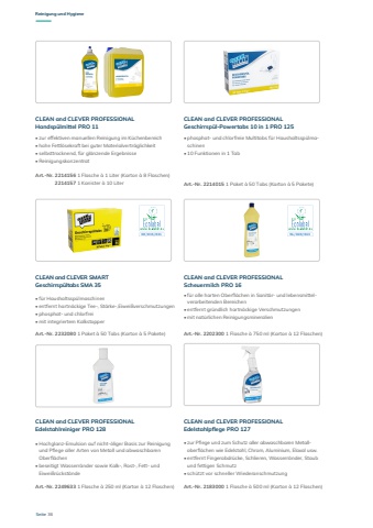 Seite 36CLEAN and CLEVER PROFESSIONAL Handsp%u00fclmittel PRO 11CLEAN and CLEVER SMART Geschirrsp%u00fcltabs SMA 35CLEAN and CLEVER PROFESSIONAL Edelstahlreiniger PRO 128Art.-Nr. 2214156 1 Flasche %u00e0 1 Liter (Karton %u00e0 8 Flaschen)2214157 1 Kanister %u00e0 10 LiterArt.-Nr. 2232080 1 Paket %u00e0 50 Tabs (Karton %u00e0 5 Pakete)Art.-Nr. 2249633 1 Flasche %u00e0 250 ml (Karton %u00e0 12 Flaschen)%u2022 zur effektiven manuellen Reinigung im K%u00fcchenbereich%u2022 hohe Fettl%u00f6sekraft bei guter Materialvertr%u00e4glichkeit%u2022 selbsttrocknend, f%u00fcr gl%u00e4nzende Ergebnisse%u2022 Reinigungskonzentrat%u2022 f%u00fcr Haushaltssp%u00fclmaschinen%u2022 entfernt hartn%u00e4ckige Tee-, St%u00e4rke-,Eiwei%u00dfverschmutzungen%u2022 phosphat- und chlorfrei%u2022 mit integriertem Kalkstopper%u2022 Hochglanz-Emulsion auf nicht-%u00f6liger Basis zur Reinigung und Pflege aller Arten von Metall und abwaschbaren Oberfl%u00e4chen %u2022 beseitigt Wasserr%u00e4nder sowie Kalk-, Rost-, Fett- und Eiwei%u00dfr%u00fcckst%u00e4nde%u2022 phosphat- und chlorfreie Multitabs f%u00fcr Haushaltssp%u00fclmaschinen%u2022 10 Funktionen in 1 Tab%u2022 f%u00fcr alle harten Oberfl%u00e4chen in Sanit%u00e4r- und lebensmittelverarbeitenden Bereichen%u2022 entfernt gr%u00fcndlich hartn%u00e4ckige Verschmutzungen%u2022 mit nat%u00fcrlichen Reinigungsmineralien%u2022 zur Pflege und zum Schutz aller abwaschbaren Metalloberfl%u00e4chen wie Edelstahl, Chrom, Aluminium, Eloxal usw.%u2022 entfernt Fingerabdr%u00fccke, Schlieren, Wasserr%u00e4nder, Staub und fettigen Schmutz%u2022 sch%u00fctzt vor schneller WiederanschmutzungCLEAN and CLEVER PROFESSIONAL Geschirrsp%u00fcl-Powertabs 10 in 1 PRO 125CLEAN and CLEVER PROFESSIONAL Scheuermilch PRO 16CLEAN and CLEVER PROFESSIONAL Edelstahlpflege PRO 127 Art.-Nr. 2214015 1 Paket %u00e0 50 Tabs (Karton %u00e0 5 Pakete)Art.-Nr. 2202300 1 Flasche %u00e0 750 ml (Karton %u00e0 12 Flaschen)Art.-Nr. 2183000 1 Flasche %u00e0 500 ml (Karton %u00e0 12 Flaschen)Reinigung und HygieneDE/015/031 NL/020/043