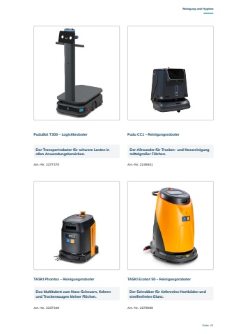 Seite 41TASKI Phantas %u2013 ReinigungsroboterPuduBot T300 %u2013 LogistikroboterArt.-Nr. 2237349Art.-Nr. 2277270TASKI Ecobot 50 %u2013 ReinigungsroboterPudu CC1 %u2013 ReinigungsroboterArt.-Nr. 2273989Art.-Nr. 2249441Das Multitalent zum Nass-Scheuern, Kehren und Trockensaugen kleiner Fl%u00e4chen.Der Transportroboter f%u00fcr schwere Lasten in allen Anwendungsbereichen.Der Allrounder f%u00fcr Trocken- und Nassreinigung mittelgro%u00dfer Fl%u00e4chen.Der Schrubber f%u00fcr tiefenreine Hartb%u00f6den und streifenfreien Glanz.Reinigung und Hygiene