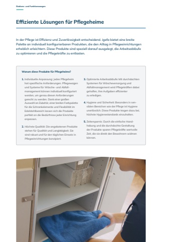Seite 14Effiziente L%u00f6sungen f%u00fcr PflegeheimeWarum diese Produkte f%u00fcr Pflegeheime?1. Individuelle Anpassung: Jedes Pflegeheimhat spezifische Anforderungen. Pflege%u00adwagenund %u00adSysteme f%u00fcr W%u00e4sche- und Abfallmanagement k%u00f6nnen individuell konfiguriertwerden, um genau diesen Anforderungengerecht zu werden. Dank einer gro%u00dfen %u00adAuswahl an Zubeh%u00f6r, einer %u00adbreiten Farbpalettef%u00fcr die Schrankelemente und %u00adFlexibilit%u00e4t imEdelstahlbereich lassen sich die Produkte perfekt an die Bed%u00fcrfnisse jeder Einrichtung anpassen.2. H%u00f6chste Qualit%u00e4t: Die angebotenen Produkte%u00adstehen f%u00fcr Qualit%u00e4t und Langlebigkeit. Siesind robust und f%u00fcr den t%u00e4glichen Einsatz inPflege%u00adeinrichtungen konzipiert.3. Optimierte Arbeitsabl%u00e4ufe: Mit %u00addurchdachtenSystemen f%u00fcr W%u00e4scheversorgung und%u00adAbfallmanagement wird Pflegekr%u00e4ften dabeigeholfen, ihre Aufgaben effizienterzu erledigen.4. Hygiene und Sicherheit: Besonders in sensiblen Bereichen wie der Pflege ist Hygieneunerl%u00e4sslich. Diese Produkte tragen dazu bei,h%u00f6chste Hygienestandards einzuhalten.5. Zeitersparnis: Durch die einfache Handhabung und die durchdachte Gestaltung der Produkte %u00adsparen Pflegekr%u00e4fte wertvolleZeit, die sie direkt den Bewohnern widmen k%u00f6nnen.In der Pflege ist Effizienz und Zuverl%u00e4ssigkeit entscheidend. igefa bietet eine breitePalette an individuell konfigurierbaren Produkten, die den Alltag in Pflegeeinrichtungen%u00aderheblich erleichtern. Diese Produkte sind speziell darauf ausgelegt, die Arbeitsabl%u00e4ufezu %u00adoptimieren und die Pflegekr%u00e4fte zu entlasten.Stations- und Funktionswagen
