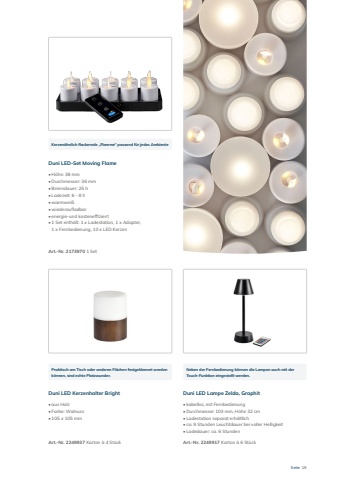 Seite 19Duni LED-Set Moving Flame Art.-Nr. 2173970 1 SetDuni LED Kerzenhalter Bright Duni LED Lampe Zelda, Graphit Art.-Nr. 2249937 Karton %u00e0 4 St%u00fcck%u2022 aus Holz%u2022 Farbe: Walnuss%u2022 105 x 105 mm%u2022 kabellos, mit Fernbedienung%u2022 Durchmesser 103 mm, H%u00f6he 32 cm%u2022 Ladestation separat erh%u00e4ltlich%u2022 ca. 9 Stunden Leuchtdauer bei voller Helligkeit%u2022 Ladedauer: ca. 6 Stunden%u2022 H%u00f6he: 38 mm%u2022 Durchmesser: 36 mm%u2022 Brenndauer: 25 h%u2022 Ladezeit: 6 - 8 h%u2022 warmwei%u00df%u2022 wiederaufladbar%u2022 energie-und kosteneffizient%u2022 1 Set enth%u00e4lt: 1 x Ladestation, 1 x Adapter,1 x Fernbedienung, 10 x LED KerzenArt.-Nr. 2249917 Karton %u00e0 6 St%u00fcckKerzen%u00e4hnlich flackernde %u201eFlamme%u201c passend f%u00fcr jedes Ambiente Praktisch am Tisch oder anderen Fl%u00e4chen festgeklemmt werden k%u00f6nnen, sind echte Platzwunder. Neben der Fernbedienung k%u00f6nnen die Lampen auch mit der Touch-Funktion eingestellt werden.