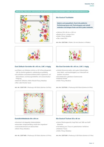 Seite 21Gedeckter Tisch%u2022 auf Basis von Zellulose mit bis zu 20 % Recyclinganteil, 100 % chlorfrei gebleicht, vollst%u00e4ndig recyclef%u00e4hig%u2022 Druckfarben sind lebensmittelrechtlich zugelassen, auf Wasserbasis und l%u00f6sungsmittelfrei, mit LeinenstrukturPr%u00e4gung%u2022 Material: Zellulose, Motiv Klassik Flowy Meadow%u2022 %u00d6ko-Label Nordic SwanDuni Zelltuch-Serviette 40 x 40 cm, 1/4F, 4-lagigArt.-Nr. 2237178 1 Packung %u00e0 50 St%u00fcck (Karton %u00e0 6 Pac)%u2022 Airlaid-Dinnerserviette, sehr gutes Faltverhalten,hohe Rei%u00df- und Nassfestigkeit, aus Vliesstoff mit textilem Aussehen%u2022 Einsatzbereich: gehobene Gastronomie%u2022 Material Airlaid%u2022 Motiv Flowy MeadowBio-Duni Serviette 40 x 40 cm, 1/4F, 1-lagigArt.-Nr. 2237191 1 Packung %u00e0 60 St%u00fcck (Karton %u00e0 6 Pac)%u2022 fasziniert mit doppelter Materialst%u00e4rke%u2022 besonders strapazierf%u00e4hig, erh%u00f6ht die Liegedauer%u2022 wasserabweisend und abwischbar%u2022 Motiv Flowy MeadowDunisilk Mitteldecke 84 x 84 cmArt.-Nr. 2237165 1 Packung %u00e0 20 St%u00fcck (Karton %u00e0 5 Pac)%u2022 hohes Fl%u00e4chengewicht, liegt flach auf, f%u00e4llt wie Stoff,faltenfrei%u2022 Herstellung aus Tissue in patentiertem Verfahren%u2022 Material: Tissue%u2022 Motiv: Flowy MeadowBio-Dunicel Tischset 30 x 40 cmArt.-Nr. 2237193 1 Packung %u00e0 100 St%u00fcck (Karton %u00e0 5 Pac)%u2022 Abrisse 20 %u00e0 40 cm x 120 cm%u2022 Breite 40 cm x L%u00e4nge 24 m%u2022 Motiv: Flowy Meadow%u2022 %u00d6ko-Label FSC%u00aeBio-Dunicel Tischl%u00e4uferArt.-Nr. 2237194 1 Rolle %u00e0 24 mtr (Karton %u00e0 4 Rollen)SERVIETTEN, TISCH SETS, TISCHL%u00c4UFER UND MITTELDECKEN IN VERSCHIEDENEN FARBEN UND MUSTERN ERH%u00c4LTLICH.Modern und sympathisch. Durch die praktische Perforierung lassen sich Tische bequem und schnell eindecken und bringen Farbe und Stil in jedes Ambiente.