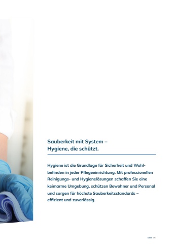 Seite 35Sauberkeit mit System %u2013 Hygiene, die sch%u00fctzt.Hygiene ist die Grundlage f%u00fcr Sicherheit und Wohlbefinden in jeder Pflegeeinrichtung. Mit professionellen Reinigungs- und Hygienel%u00f6sungen schaffen Sie eine keimarme Umgebung, sch%u00fctzen Bewohner und Personal und sorgen f%u00fcr h%u00f6chste Sauberkeitsstandards %u2013 effizient und zuverl%u00e4ssig.