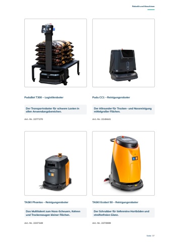 Seite 37Robotik und MaschinenTASKI Phantas %u2013 ReinigungsroboterPuduBot T300 %u2013 LogistikroboterArt.-Nr. 2237349Art.-Nr. 2277270TASKI Ecobot 50 %u2013 ReinigungsroboterPudu CC1 %u2013 ReinigungsroboterArt.-Nr. 2273989Art.-Nr. 2249441Das Multitalent zum Nass-Scheuern, Kehren und Trockensaugen kleiner Fl%u00e4chen.Der Transportroboter f%u00fcr schwere Lasten in allen Anwendungsbereichen.Der Allrounder f%u00fcr Trocken- und Nassreinigung mittelgro%u00dfer Fl%u00e4chen.Der Schrubber f%u00fcr tiefenreine Hartb%u00f6den und streifenfreien Glanz.