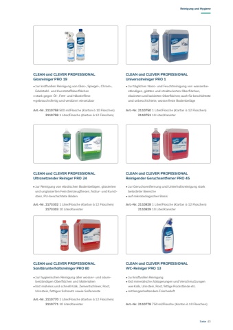 Seite 43CLEAN and CLEVER PROFESSIONAL Glasreiniger PRO 19CLEAN and CLEVER PROFESSIONAL Ultranetzender Reiniger PRO 24CLEAN and CLEVER PROFESSIONAL Sanit%u00e4runterhaltsreiniger PRO 80Art.-Nr. 2110758 500 ml/Flasche (Karton %u00e0 10 Flaschen)2110759 1 Liter/Flasche (Karton %u00e0 12 Flaschen)Art.-Nr. 2110770 1 Liter/Flasche (Karton %u00e0 12 Flaschen)2110771 10 Liter/Kanister%u2022 zur kraftvollen Reinigung von Glas-, Spiegel-, Chrom-,Edelstahl- und Kunststoffoberfl%u00e4chen%u2022 stark gegen %u00d6l-, Fett- und Nikotinfilme%u2022 gebrauchsfertig und verd%u00fcnnt einsetzbar%u2022 zur Reinigung von elastischen Bodenbel%u00e4gen, glasiertenund unglasierten Feinsteinzeugfliesen, Natur- und Kunststein, PU-beschichtete B%u00f6den%u2022 zur hygienischen Reinigung aller wasser- und s%u00e4urebest%u00e4ndigen Oberfl%u00e4chen und Materialien%u2022 l%u00f6st m%u00fchelos und schnell Kalk, Zementschleier, Rost, Urinstein, fettigen Schmutz sowie Seifenreste%u2022 zur t%u00e4glichen Nass- und Feuchtreinigung von wasserbest%u00e4ndigen, glatten und strukturierten Oberfl%u00e4chen,eloxierten und lackierten Oberfl%u00e4chen; auch f%u00fcr %u00adbeschichteteund unbeschichtete, wasserfeste Bodenbel%u00e4ge%u2022 zur Geruchsentfernung und Unterhaltsreinigung stark belasteter Bereiche%u2022 auf mikrobiologischer Basis%u2022 zur kraftvollen Reinigung%u2022 l%u00f6st mineralische Ablagerungen und Verschmutzungenwie Kalk, Urinstein, Rost, fettige R%u00fcckst%u00e4nde etc.%u2022 mit langanhaltendem FrischeduftCLEAN and CLEVER PROFESSIONAL Universalreiniger PRO 1CLEAN and CLEVER PROFESSIONAL Reinigender Geruchsentferner PRO 45CLEAN and CLEVER PROFESSIONAL WC-Reiniger PRO 13Art.-Nr. 2110750 1 Liter/Flasche (Karton %u00e0 12 Flaschen)2110751 10 Liter/KanisterArt.-Nr. 2110778 750 ml/Flasche (Karton %u00e0 10 Flaschen)Reinigung und HygieneArt.-Nr. 2173302 1 Liter/Flasche (Karton %u00e0 12 Flaschen) 2173303 10 Liter/KanisterArt.-Nr. 2110828 1 Liter/Flasche (Karton %u00e0 12 Flaschen) 2110829 10 Liter/Kanister
