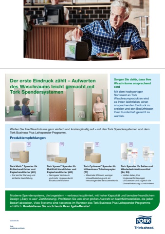 Seite 49www.tork.deTork, eine Marke von EssityDer erste Eindruck z%u00e4hlt %u2013 Aufwerten des Waschraums leicht gemacht mit Tork Spendersystemen Sorgen Sie daf%u00fcr, dass Ihre Waschr%u00e4ume ansprechend sindMit dem hochwertigen Sortiment an Tork Waschraumprodukten wird es Ihnen leichtfallen, einen ansprechenden Eindruck zu erzielen und den Bed%u00fcrfnissen Ihrer Kundschaft gerecht zu werden. Werten Sie Ihre Waschr%u00e4ume ganz einfach und kosteng%u00fcnstig auf %u2013 mit den Tork Spendersystemen und dem Tork Business Plus Leihspender-Programm.ProduktempfehlungenTork Matic%u00ae Spender f%u00fcr Rollenhandt%u00fccher und Papierhandt%u00fccher (H1)%u2013 F%u00fcr leichte Wartung und einfache Nachf%u00fcllung Tork Xpress%u00ae Spender f%u00fcr Multifold Handt%u00fccher und Papierhandt%u00fccher (H2)%u2013 Geringerer Verbrauch und mehr Hygiene durch EinzeltuchentnahmeTork Optiserve%u00ae Spender f%u00fcr H%u00fclsenloses Toilettenpapier (T7)%u2013 Maximale Effizienz, weniger Umweltbelastung und ein hervorragendes BenutzererlebnisTork Spender f%u00fcr Seifen und H%u00e4ndedesinfektionsmittel (S4, S5)%u2013 Helfen dabei, Ihre Hygieneanforderungen umzusetzen und zugleich die Umweltbelastung zu minimierenModerne Spendersysteme, die begeistern %u2013 verbrauchsoptimiert, mit hoher Kapazit%u00e4t und benutzerfreundlichem Design (%u201eEasy to use%u201c-Zertifizierung). Profitieren Sie von einer gro%u00dfen Auswahl an Nachf%u00fcllmaterialien, die jeden Bedarf abdecken. Viele Systeme sind kostenlos im Rahmen des Tork Business Plus Leihspender Programms erh%u00e4ltlich. Kontaktieren Sie noch heute Ihren Igefa-Berater!