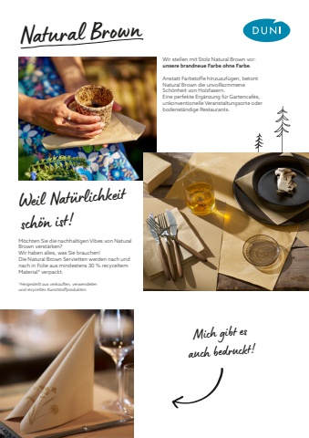 Seite 50Natural BrownWeil Nat%u00fcrlichkeit sch%u00f6n ist!Wir stellen mit Stolz Natural Brown vor: unsere brandneue Farbe ohne Farbe. Anstatt Farbstoffe hinzuzuf%u00fcgen, betont Natural Brown die unvollkommene Sch%u00f6nheit von Holzfasern. Eine perfekte Erg%u00e4nzung f%u00fcr Gartencaf%u00e9s, unkonventionelle Veranstaltungsorte oder bodenst%u00e4ndige Restaurants. M%u00f6chten Sie die nachhaltigen Vibes von Natural Brown verst%u00e4rken? Wir haben alles, was Sie brauchen! Die Natural Brown Servietten werden nach und nach in Folie aus mindestens 30 % recyceltem Material* verpackt. *Hergestellt aus verkauften, verwendetenund recycelten Kunststoffprodukten.Mich gibt esauch bedruckt!