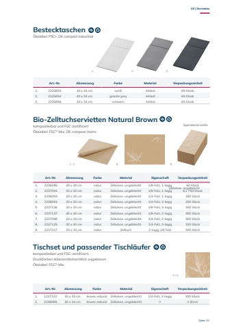 Seite 5105 | ServiettenBio-Zelltuchservietten Natural Brownkompostierbar und FSC-zertifiziert%u00d6kolabel: FSC%u00ae-Mix, OK compost HomeArt.-Nr. Abmessung Farbe Material Eigenschaft Verpackungseinheit1. 2236085 40 x 40 cm natur Zellulose, ungebleicht 1/8-Falz, 1-lagig 60 St%u00fcck2. 2237094 33 x 32 cm natur Zellulose, ungebleicht 1/8-Falz, 1-lagig 6 x 750 St%u00fcck3. 2236083 20 x 20 cm natur Zellulose, ungebleicht 1/4-Falz, 1-lagig 180 St%u00fcck4. 2236084 33 x 33 cm natur Zellulose, ungebleicht 1/4-Falz, 3-lagig 250 St%u00fcck5. 2237136 33 x 33 cm natur Zellulose, ungebleicht 1/8-Falz, 3-lagig 250 St%u00fcck6. 2237137 40 x 40 cm natur Zellulose, ungebleicht 1/8-Falz, 2-lagig 300 St%u00fcck7. 2237098 24 x 24 cm natur Zellulose, ungebleicht 1/4-Falz, 2-lagig 300 St%u00fcck8. 2237125 30 x 40 cm natur Zellulose, ungebleicht 1/4-Falz, 3-lagig 100 St%u00fcck9. 2237317 33 x 33 cm natur Zelltuch 2-lagig 1/8 Falz 300 St%u00fcckBestecktaschen%u00d6kolabel: FSC%u00ae, OK compost IndustrialArt.-Nr. Abmessung Farbe Material Verpackungseinheit1. 2225853 40 x 33 cm wei%u00df Airlaid 65 St%u00fcck2. 2225854 40 x 33 cm granite grey Airlaid 65 St%u00fcck3. 2225856 40 x 33 cm schwarz Airlaid 65 St%u00fcckTischset und passender Tischl%u00e4uferkompostierbar und FSC-zertifiziert, Druckfarben lebensmittelrechtlich zugelassen%u00d6kolabel: FSC%u00ae-MixArt.-Nr. Abmessung Farbe Material Eigenschaft Verpackungseinheit1. 2237132 33 x 33 cm leaves natural Zellulose, ungebleicht 1/4-Falz, 3-lagig 300 St%u00fcck2. 2236086 40 x 24 cm leaves natural Zellulose, ungebleicht -/- 1 St%u00fcckSpenderserviette1.1.-.7.1.+2.8. 9.2. 3.Zellulose, ungebleicht