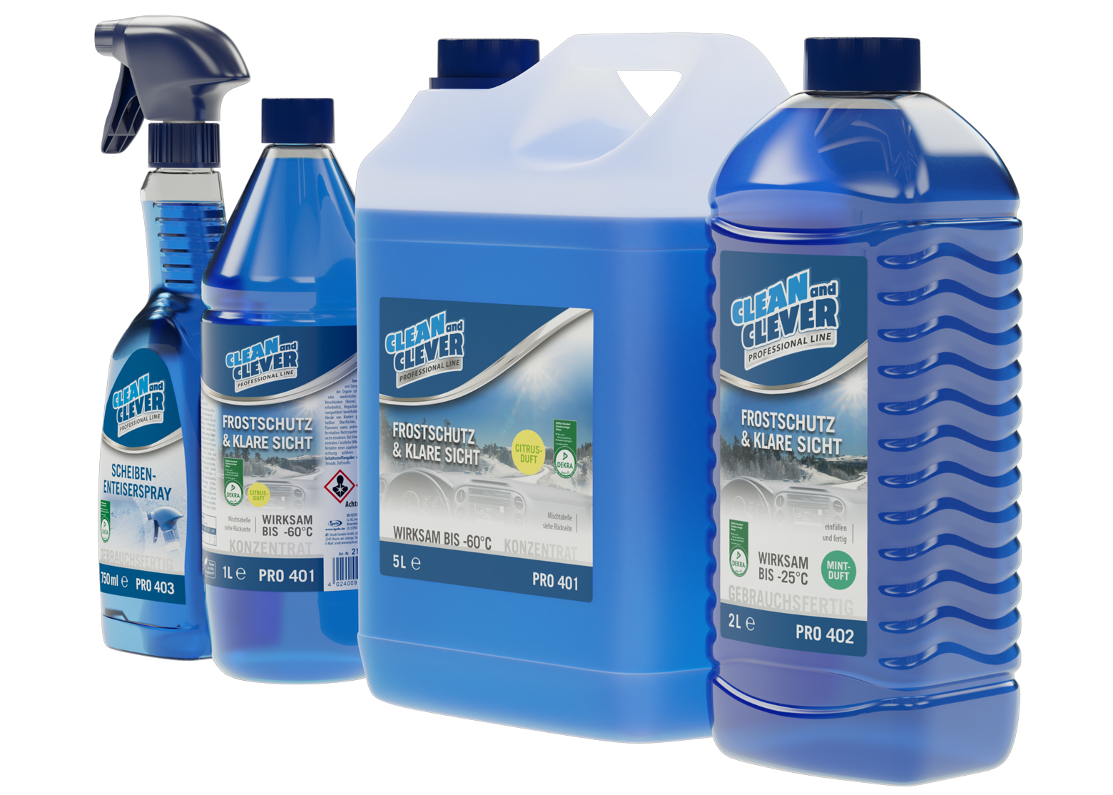 „Frostschutz & Klare Sicht PRO 401“ ist ein Konzentrat mit Citrusduft und kommt durch den Einsatz von geruchsneutralem Ethanol ohne unangenehme Gerüche aus. Es ist bis minus 60 Grad Celsius wirksam sowie lack-, gummi- und kunststoffverträglich. Das Produkt ist sowohl als 1-Liter-Flasche als auch als 5-Liter-Kanister erhältlich.