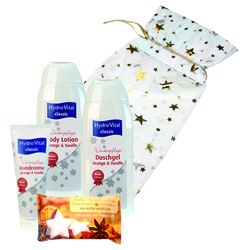 Die richtige Pflege im Winter ist wichtig und sorgt auch gleich für ein wohliges Gefühl. So sind in unserem fünften Geschenke-Set Handcreme, Bodylotion und Duschgel in einem weihnachtlichen Beutel vereint mit einer nach Mandeln duftenden Seife.